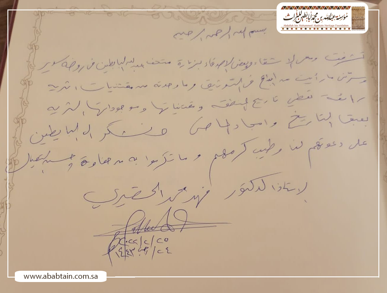زيارة الدكتور فهد الخضيري أستاذ وعالم أبحاث المسرطنات وضيوفه الكرام لمؤسسة عبدالله بن محمد أبابطين الثقافية للتعرف على المتاحف التراثية والمعارض الثقافية والتاريخية والمكتبة الوثائقية