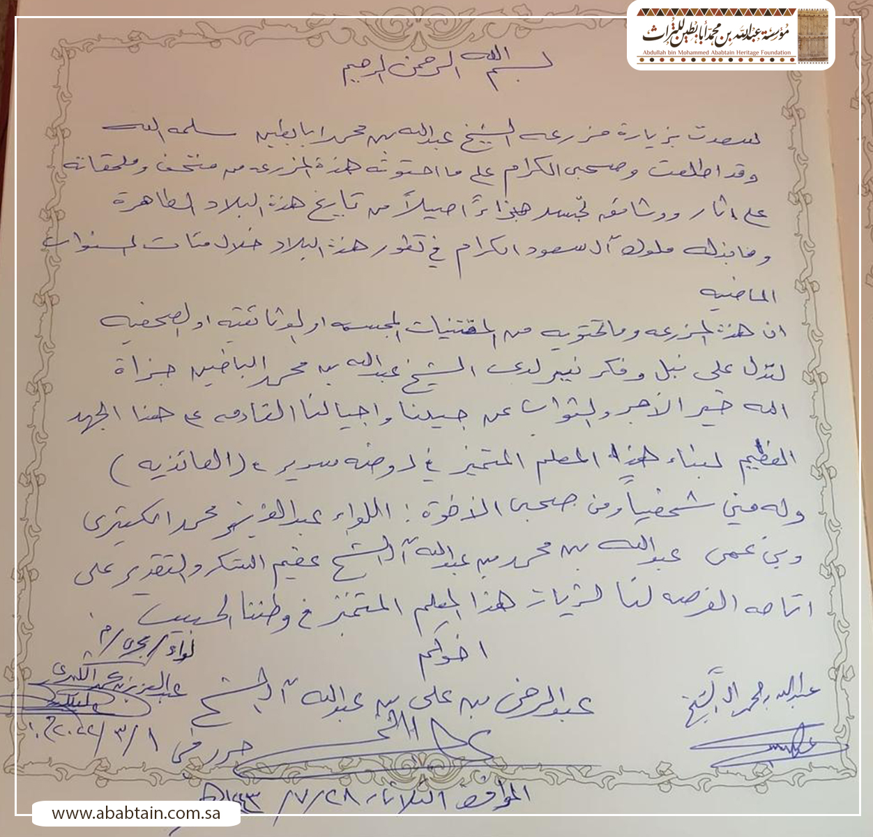 تأتي تلك الزيارة في إطار برنامج التعريف بتراث الآباء والأجداد، حيث بدأ الزوار جولتهم بزيارة مجلس (قهوة) الشيخ محمد بن عبدالمحسن أبابطين وهو مجلس تاريخي استضاف أئمة آل سعود والعلماء والقضاة وخصص مجانًا للمناسبات الحكومية والأهلية، ثم تم الاطلاع على أنشطة ملتقى عبدالله بن محمد أبابطين الثقافي على مدار 20 عامًا من العطاء، ثم زار الوفد متحف عبدالله بن محمد أبابطين التراثي ويضم أكثر من 10 أقسام بمحتويات تاريخية وتراثية هامة من أدوات واستعمالات قديمة تحاكي حياة الآباء والأجداد حيث تم التعرف على أهم العملات الإسلامية التاريخية النادرة والتي يرجع تاريخ بعضها لأكثر من 1000 عام، فضلاً عن التعرف على أوائل الاختراعات للأجهزة الكهربائية وآلات التصوير، كما تم زيارة أقسام الأحجار الكريمة وقسم الأسلحة التراثية المستخدمة في توحيد المملكة العربية السعودية، وقسم التراث الشعبي، وركن العروس، وقسم العملات الإسلامية وخرائط الجزيرة العربية، ويضم المتحف ما يزيد عن 10000 قطعة تراثية متنوعة.