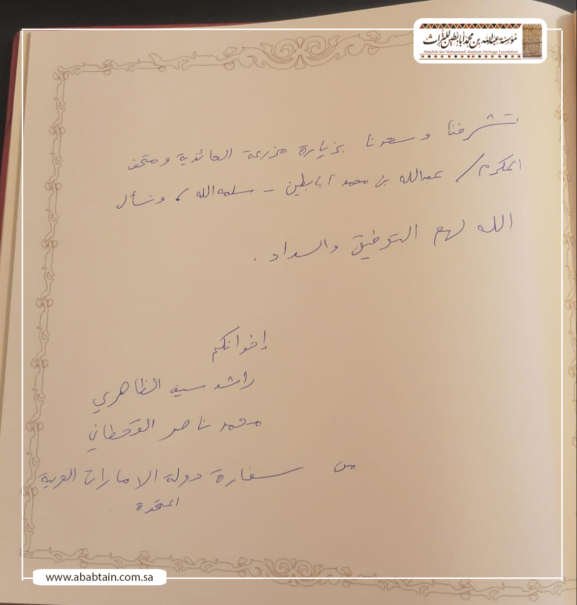بدعوة من الأستاذ عبدالعزيز بن عبدالله أبابطين (رئيس لجنة المقاولات بمجلس الأعمال السعودي الإماراتي)، استضافت مؤسسة عبدالله بن محمد أبابطين الثقافية كلاً من سعادة الأستاذ راشد بن سيف الظاهري (رئيس القسم القنصلي بسفارة دولة الإمارات العربية المتحدة لدى المملكة) وسعادة الأستاذ محمد بن ناصر القحطاني (رئيس قسم الشؤون التجارية بسفارة الإمارات لدى المملكة) بمزرعة «العائذية» بروضة سدير اليوم السبت 4-4-1444هـ، والاطلاع على أنشطة المؤسسة التراثية والتعرف على أهم المقتنيات في متحف أبابطين التراثي، وعلى محتويات مكتبة سدير الوثائقية.