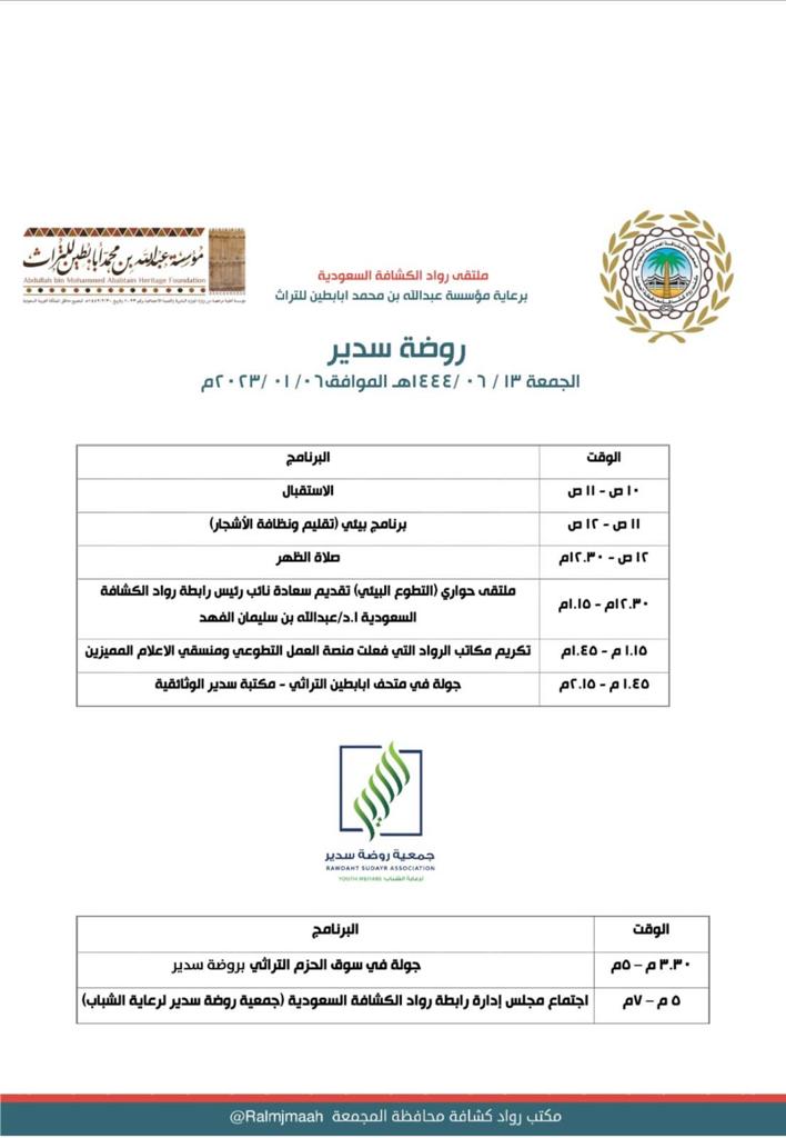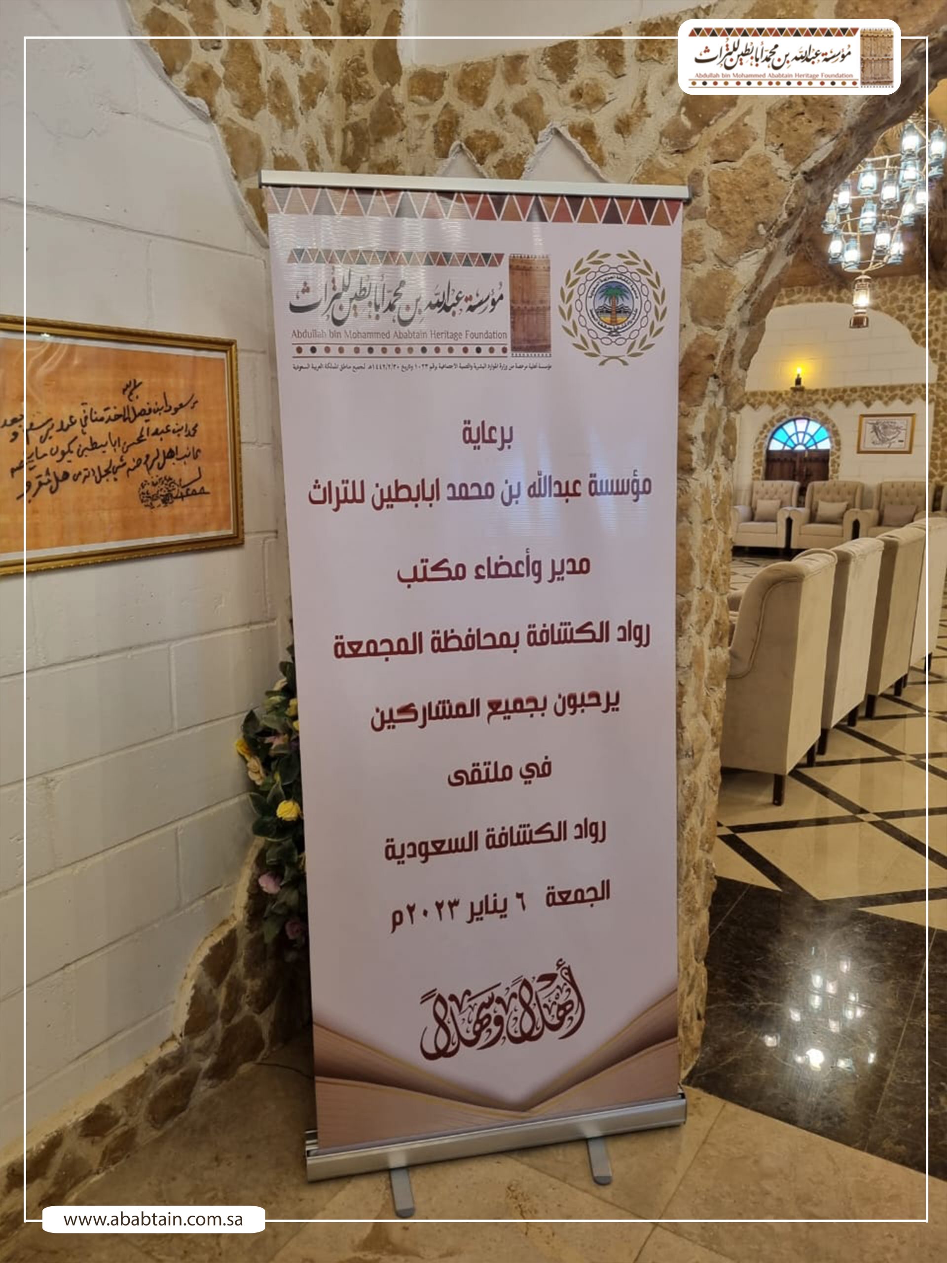 استضافت مؤسسة عبدالله بن محمد أبابطين الثقافية بمزرعة «العائذية» ملتقى رواد الكشافة السعودية وحفل كشافة المجمعة، أمس الجمعة 6 يناير 2023م، بالتنسيق مع سعادة الرائد الكشفي أ. علي بن عبدالعزيز العلي مدير مكتب رواد كشافة محافظة المجمعة، بحضور سعادة الدكتور عبدالله بن سليمان الفهد رئيس رابطة رواد الكشافة السعودية، وقرابة 60 عضوًا من رواد الكشافة السعودية.