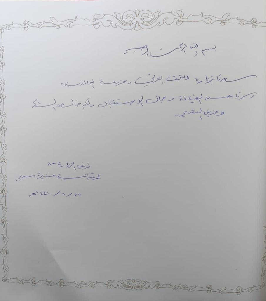 وفي نهاية الزيارة تم تدوين كلمة نصها : «سعدنا بزيارة المتحف التراثي ومزعة العائذية، وسرنا حسن الضيافة وجمال الاستقبال، ولكم خالص الشكر وجزيل التقدير».